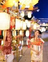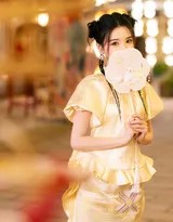 毛晓彤的这身造型可谓匠心独具。明黄色的衣裙在深蓝的夜色与暖红的灯笼映衬下,格外醒目亮丽,既保留了古代服饰的典雅韵味,又在剪裁与细节上融入了现代审美。衣裙上精致的刺绣纹样在灯光下若隐若现,外披的轻纱材质更添几分飘逸与灵动。她的发髻梳得一丝不苟,点缀着与服装色彩相呼应的发饰,妆容清丽脱俗,腮红与口脂的点缀恰到好处,映衬出她白皙的肌肤与精致的五官,尤其是那双灵动的眼眸,在灯光映照下顾盼生辉,写满了对周遭美景的好奇与欣喜。