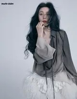 在这组大片中,范冰冰标志性的黑发如瀑,与雪白的肌肤、鲜红的唇色形成经典而强烈的视觉对比,魅惑而唯美。而湿发造型搭配慵懒的姿态,又为这份精致增添了一丝随性与神秘感。这种矛盾感的巧妙融合——冷艳与温柔、强势与静谧、精致与慵懒——正是此次拍摄最打动人心之处。它不像她早年一些极具话题性的造型那样具有直接的冲击力(例如2009年《时尚先生》封面上突破性的“刮胡子”造型,或是2011年与国际设计师在深宅大院里打麻将的戏剧化场景),而是选择了一种向内探索的表达,通过细腻的神态与肢体语言,传递出更为复杂和深厚的情绪。