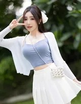 从更广义的时尚视角看,这套搭配完美印证了“比例游戏”的魔力。上身的紧致包裹与下装的利落短打,通过明确的腰线划分出黄金比例。露肤度的巧妙控制——肩颈的展露、腰线的提示以及腿部的呈现——在性感与得体之间找到了精准的平衡点。这正是当代都市着装智慧的体现:不过分夸张,却足够吸睛;强调女性特质,同时充满力量感。蓝色与白色的配色方案,清新脱俗,四季皆宜,具备极高的参考价值与复刻可能,为日常穿搭提供了绝佳的灵感范本。