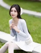 白色短裙则负责挥洒青春活力与动态美感。短款设计在视觉上最大化地延伸了腿部线条,这对于本就高挑的模特而言,无疑是锦上添花,将身材优势放大至极致。短裙随着模特的步履轻轻摆动,或是在其倚靠、坐姿间形成自然的褶皱,为静态的画面注入了生动的韵律。它与丝袜的组合堪称经典:丝袜那层轻薄的存在,柔化了肌肤的质感,增添了一抹朦胧而细腻的韵味,使得腿部线条在若隐若现中更显修长笔直。而尖头高跟鞋,则是塑造强大气场的最后一块拼图,它不仅进一步拉长了身形比例,更以铿锵有力的步点,敲响了属于都市女郎的独立宣言。