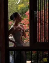 这组写真的成功,还在于其对光影的巧妙运用。摄影师充分利用了园林中自然的光线变化。午后暖阳透过枫叶的缝隙,在她身上投下斑驳陆离的光影;黄昏时分,斜阳拉长了身影,为画面镀上一层金色的柔光;室内场景则利用窗棂的格栅光影,营造出静谧而富有层次的空间感。光影不仅塑造了人物的立体感,更渲染出浓淡相宜、虚实相生的中国画意境。