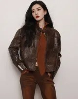 此次造型的核心单品——皮咖色夹克,选色极具巧思。相较于常见的黑色皮革,咖色更显柔和与复古,兼具皮革的硬朗与大地色的温暖,与秋日氛围不谋而合。短款修身的设计轻松提升腰线,优化身材比例,而皮质面料特有的光泽与纹理,则为整体造型注入了一丝不羁的机车风帅气感。刘诗诗内搭简约的浅色上衣,形成柔和过渡,让皮革外套不至于过分强势,反而在飒爽中透出几分亲和。